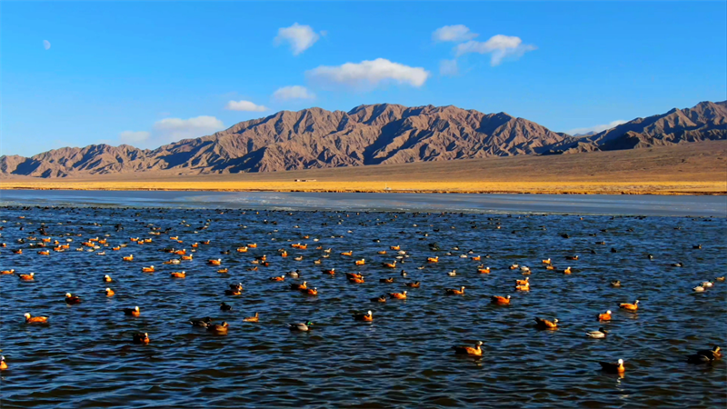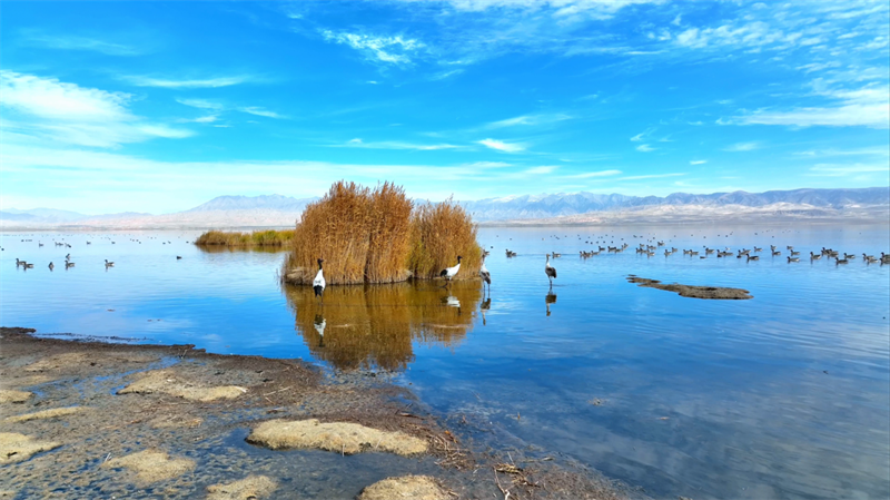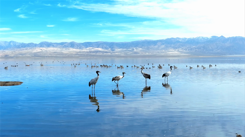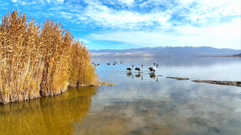 初冬時節(jié),在青海省海西蒙古族藏族自治州烏蘭縣都蘭湖國家濕地公園內(nèi),四只國家一級保護(hù)動物黑頸鶴,踏著黑色細(xì)長的腿在湖中閑庭信步,與斑頭雁、赤麻鴨一起嬉戲覓食,盡顯柴達(dá)木盆地濕地生態(tài)之美。(楊澤秋、任靜、謝海群)