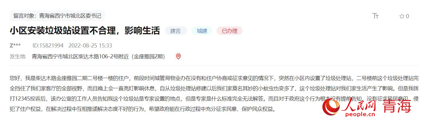 “2號(hào)樓前這個(gè)垃圾處理站完全擋住了我們家客廳的視野,而且晚上會(huì)一直亮燈影響休息,自從垃圾處理站修建以后家里小蚊蟲(chóng)也變多了,這個(gè)垃圾處理站對(duì)我們家生活產(chǎn)生了影響?!?月25日,有西寧市城北區(qū)柴達(dá)木路金座雅園二期的群眾在人民網(wǎng)“領(lǐng)導(dǎo)留言板”留言表示,自家小區(qū)內(nèi)設(shè)置的垃圾處理站對(duì)生活產(chǎn)生影響,并且認(rèn)為城北區(qū)城管局物業(yè)辦公室在沒(méi)有和小區(qū)居民協(xié)商的情況下設(shè)置垃圾站,未充分征求居民意見(jiàn)。