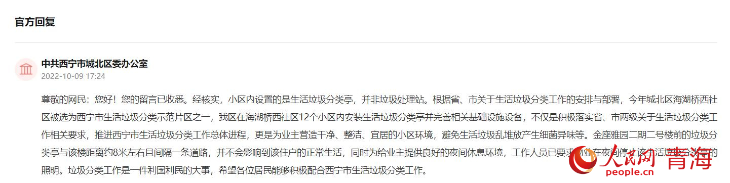 收到留言后,城北區(qū)委辦公室作出回復(fù):經(jīng)核實(shí),小區(qū)內(nèi)設(shè)置的是生活垃圾分類亭,并非垃圾處理站。根據(jù)省、市關(guān)于生活垃圾分類工作的安排與部署,今年城北區(qū)海湖橋西社區(qū)被選為西寧市生活垃圾分類示范片區(qū)之一,城北區(qū)在海湖橋西社區(qū)12個(gè)小區(qū)內(nèi)安裝生活垃圾分類亭并完善相關(guān)基礎(chǔ)設(shè)施設(shè)備,不僅是積極落實(shí)省、市兩級(jí)關(guān)于生活垃圾分類工作相關(guān)要求,推進(jìn)西寧市生活垃圾分類工作總體進(jìn)程,更是為業(yè)主營(yíng)造干凈、整潔、宜居的小區(qū)環(huán)境,避免生活垃圾亂堆放產(chǎn)生細(xì)菌異味等。金座雅園二期2號(hào)樓前的垃圾分類亭與該樓距離約8米左右且間隔一條道路,為給業(yè)主提供良好的夜間休息環(huán)境,工作人員已要求該小區(qū)物業(yè)在夜間停止該生活垃圾分類亭的照明。