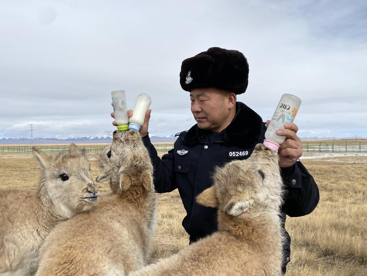 趙新錄照看救護(hù)的藏羚羊。青海省公安廳森林警察總隊(duì)供圖