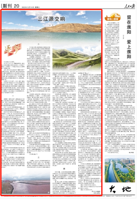這里是“中華水塔”。長(zhǎng)江、黃河、瀾滄江,三條發(fā)源于青海的大江大河,滋養(yǎng)著中華民族悠久燦爛的文明。從曾經(jīng)“守著源頭沒(méi)水喝”到鐵腕治理,再到我國(guó)首個(gè)國(guó)家公園體制試點(diǎn)的數(shù)年探索,回頭望,一些采訪過(guò)的基層干部群眾的身影浮現(xiàn)在我的腦海。他們和江水澎湃在一起,奔涌出人與自然美美與共、生生不息的新時(shí)代交響……