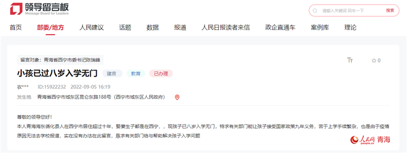 “孩子已8歲,入學無門??嘤谏蠈W手續(xù)繁雜及疫情原因無法去學校報到……”今年9月份,有群眾在人民網(wǎng)“領(lǐng)導留言板”留言反映自家孩子無法上學的問題。