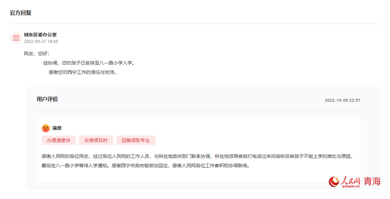 “孩子終于可以上學了,解決了家長心頭的一件大事?!北揪W(wǎng)回訪時,該留言人表示,起初看著孩子遲遲不能入學,十分著急。