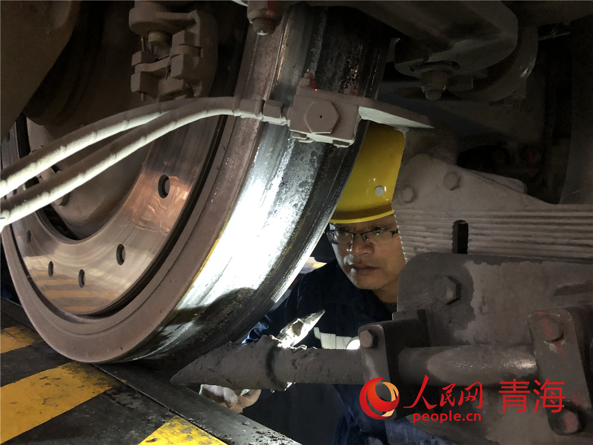 王強(qiáng)正在檢查火車(chē)頭底盤(pán)。人民網(wǎng) 劉沛然攝