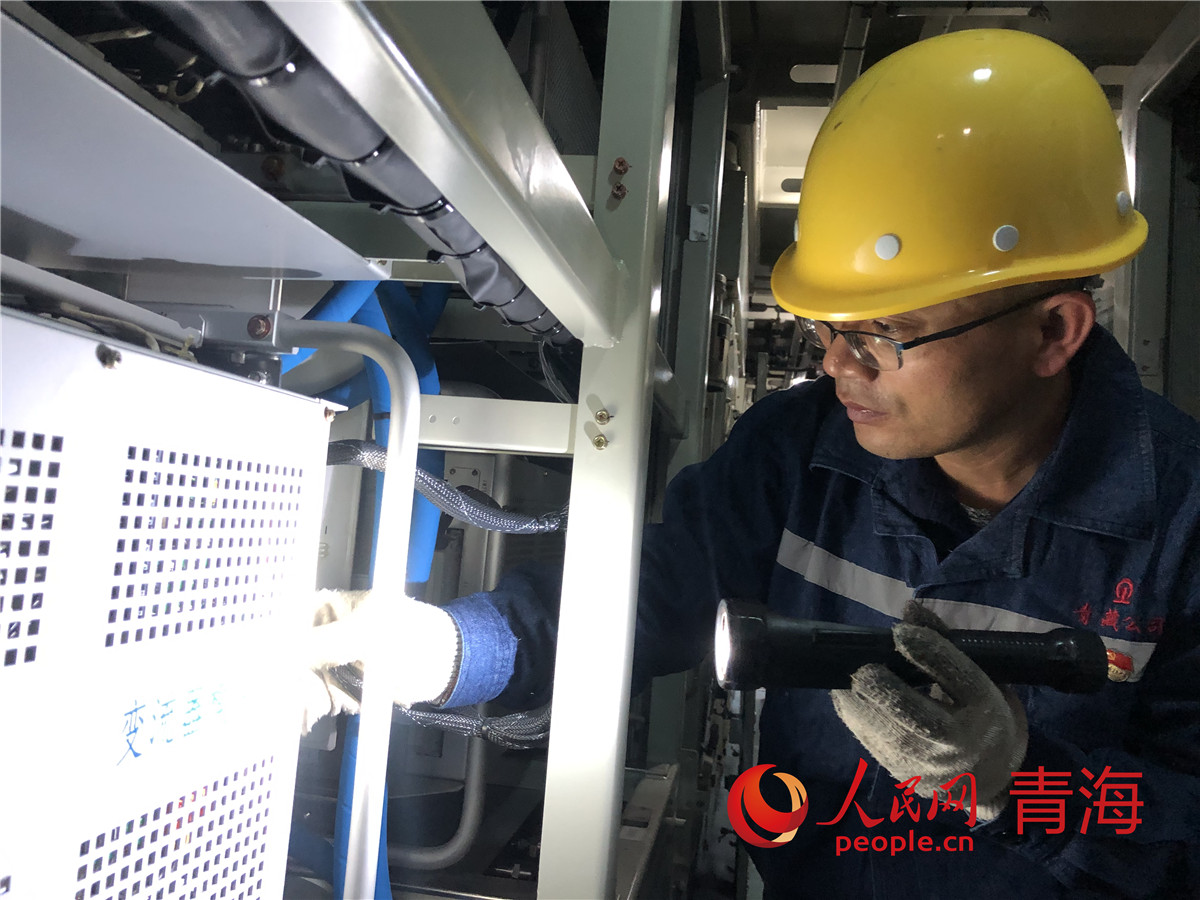 王強(qiáng)正在檢查車(chē)廂內(nèi)的電氣化設(shè)備。人民網(wǎng) 劉沛然攝