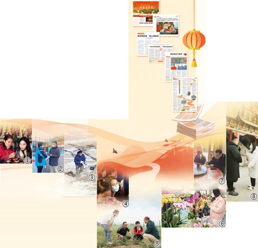圖①至圖⑧依次為本報(bào)重慶分社記者王欣悅(右),上海分社記者巨云鵬(右),西藏分社記者徐馭堯,經(jīng)濟(jì)社會(huì)部記者李心萍(右),海南分社記者趙鵬(左二)、孫海天(右二),云南分社記者李茂穎(右),安徽分社記者田先進(jìn)(右),人民網(wǎng)記者顧斐菲(右)在“新春走基層”活動(dòng)中深入采訪。