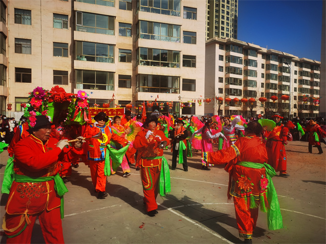 精彩的社火表演拉開了“百家宴”的序幕,隨著鏗鏘有力的鑼鼓聲,一黃一藍(lán)兩條龍上下翻騰跳躍,時(shí)而高聳、時(shí)而低臥,似飛沖云端又像入海破浪、蜿蜒騰挪。舞獅表演者套著大紅“獅子”服飾,一人舞頭,一人擺尾,舞出了雄獅的精氣神。緊接著一個(gè)個(gè)精彩的節(jié)目把元宵節(jié)的氛圍推向了一波又一波的高潮,不時(shí)傳來村民們的陣陣喝彩聲和掌聲。