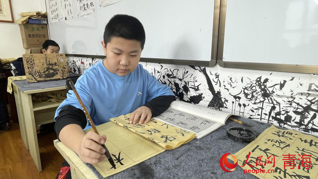 正在上書(shū)法課的岳進(jìn)哲。人民網(wǎng) 陳明菊攝
