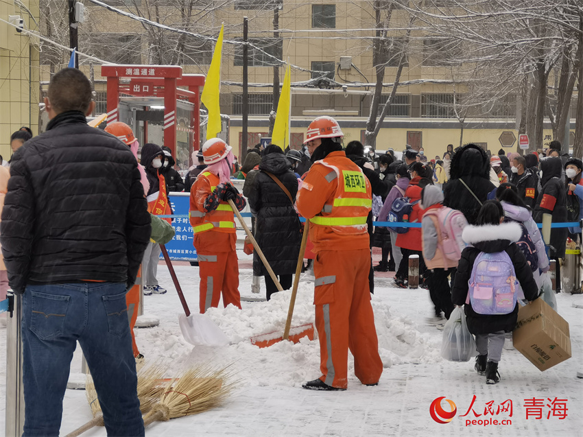 環(huán)衛(wèi)工人為孩子們清掃積雪疏通道路。人民網(wǎng) 馬盛楠攝