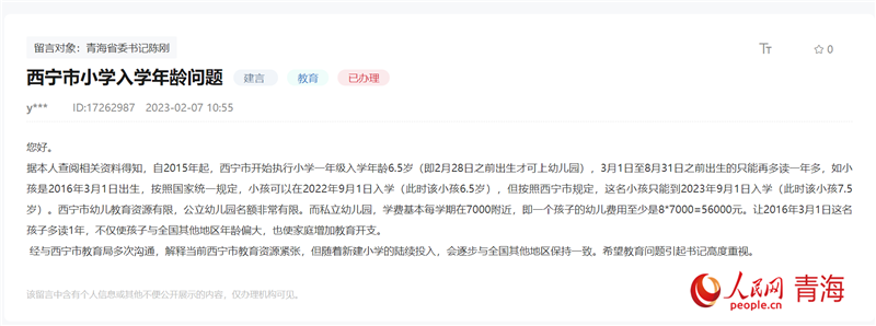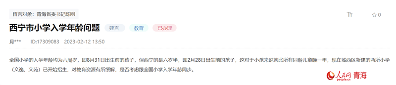 同時(shí),從人民網(wǎng)“領(lǐng)導(dǎo)留言板”的留言來(lái)看,不少群眾就西寧是否會(huì)考慮跟全國(guó)同步小學(xué)入學(xué)年齡這一問(wèn)題存有期待。