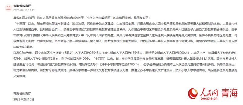 針對(duì)此問(wèn)題,青海省教育廳解釋了原因:為保障西寧市城區(qū)戶籍適齡兒童及外來(lái)人口隨遷子女接受義務(wù)教育的合法權(quán)益,西寧市教育行政部門根據(jù)《中華人民共和國(guó)義務(wù)教育法》中“凡年滿六周歲的兒童,其父母或者其他法定監(jiān)護(hù)人應(yīng)當(dāng)送其入學(xué)接受并完成義務(wù)教育,條件不具備的地區(qū)的兒童,可以推遲到七周歲”的有關(guān)規(guī)定,結(jié)合城區(qū)小學(xué)一年級(jí)適齡兒童入學(xué)人口總數(shù)及學(xué)校招生能力實(shí)際,對(duì)城區(qū)小學(xué)一年級(jí)入學(xué)年齡進(jìn)行測(cè)算分析,確定西寧市城區(qū)一年級(jí)招生入學(xué)年齡為6.5周歲。