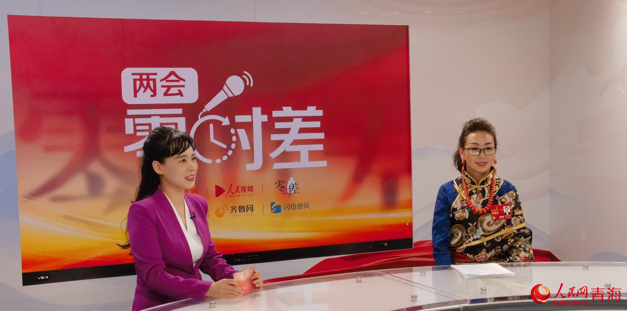 全國人大代表夏吾卓瑪(右)在代表團北京駐地接受人民日報記者視頻采訪。人民網(wǎng) 馬盛楠攝