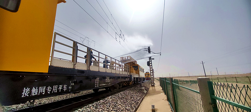 沖洗絕緣子,是因?yàn)榇呵锛敬箫L(fēng)不僅僅會(huì)揚(yáng)起沙塵,還會(huì)揚(yáng)起察爾汗鹽湖的鹽,鹽污會(huì)在絕緣子表面附著,大大降低絕緣子的爬電距離,遇到雨雪天氣就會(huì)放電,造成接觸網(wǎng)大面積跳閘,影響青藏鐵路正常行車。近年來,西寧供電段在守護(hù)“萬丈鹽橋”上加大科技投入,清洗方式由原來的使用抹布、噴水壺、小型清洗機(jī),到現(xiàn)在的高壓水槍,省時(shí)省力。