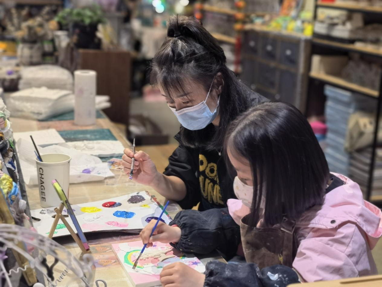 媽媽帶著孩子一起畫畫。馬可欣攝