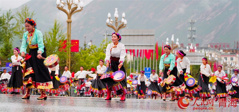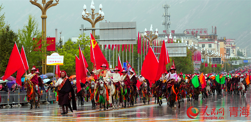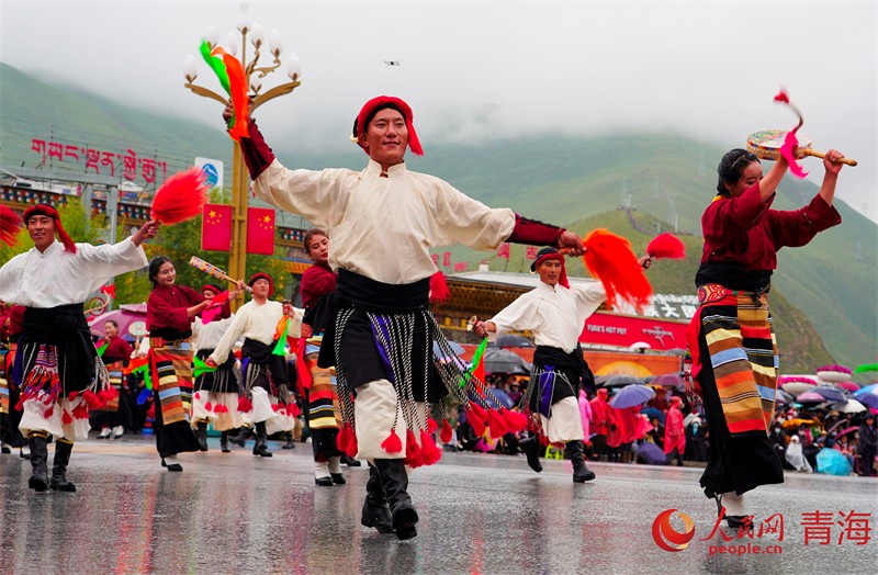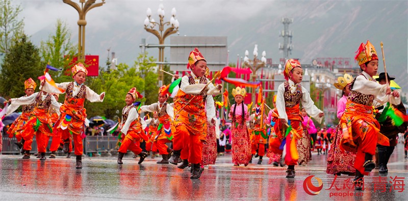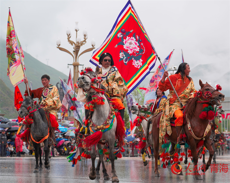 3000名康巴藏族兒女或騎馬、或著盛裝、或載歌舞,以行走巡演方式展示玉樹(shù)民俗文化及玉樹(shù)發(fā)展變化。雖然天空下著濛濛細(xì)雨,但依舊阻擋不了群眾的熱情,長(zhǎng)達(dá)一個(gè)半小時(shí)的巡游,吸引了眾多省內(nèi)外游客和當(dāng)?shù)馗髯迦罕妸A道觀賞。