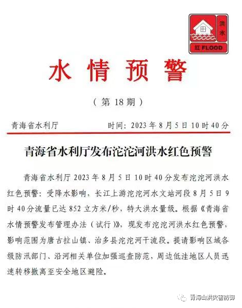 人民網(wǎng)西寧8月5日電 2023年8月5日10時40分,青海省水利廳升級發(fā)布沱沱河洪水紅色預(yù)警:受降水影響,長江上游沱沱河水文站河段8月5日9時40分流量已達852立方米/秒,特大洪水量級。根據(jù)《青海省水情預(yù)警發(fā)布管理辦法(試行)》,現(xiàn)發(fā)布沱沱河洪水紅色預(yù)警,影響范圍為唐古拉山鎮(zhèn)、治多縣沱沱河干流段。提請影響區(qū)域各級防汛部門、沿河相關(guān)單位加強巡查防范,周邊低洼地區(qū)人員迅速轉(zhuǎn)移撤離至安全地區(qū)避險。