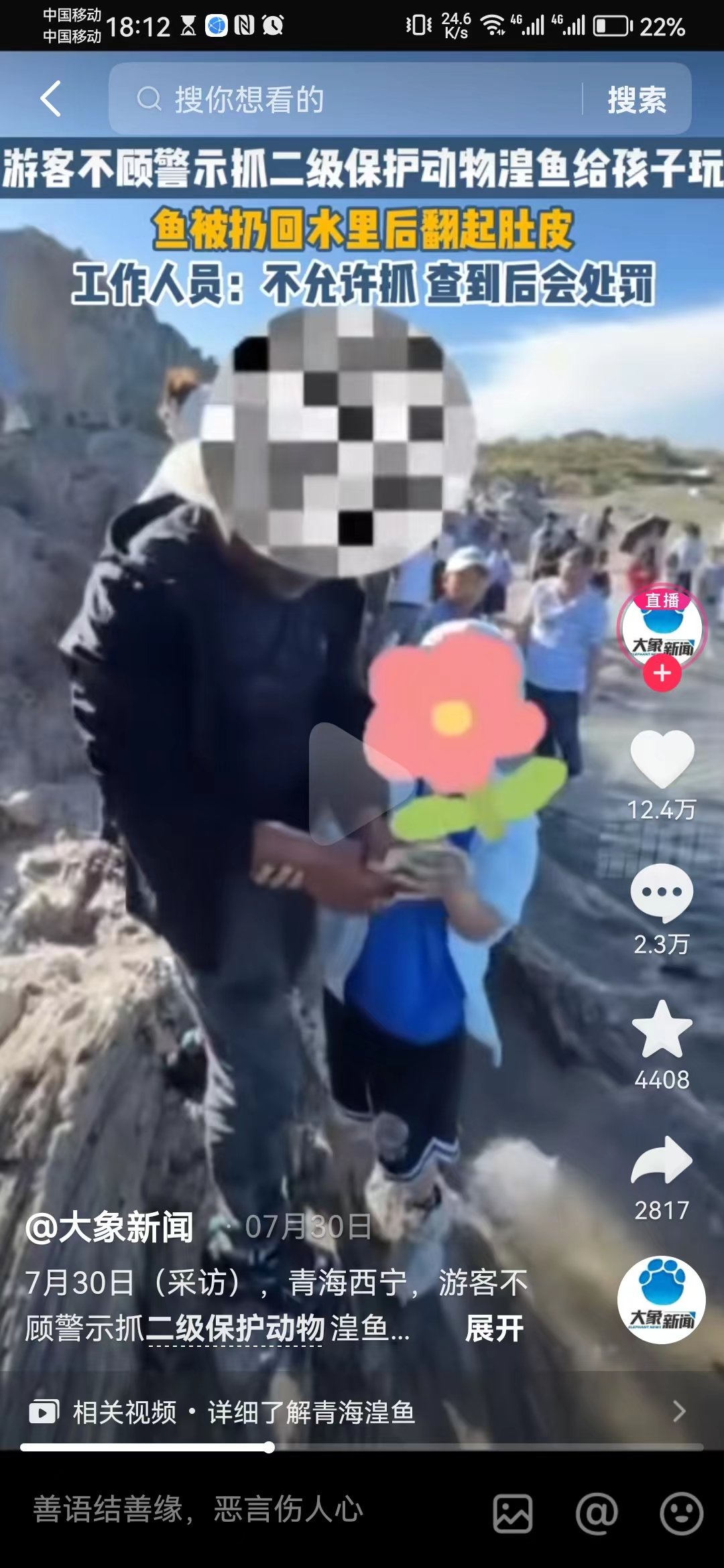 此前,有媒體披露,一名游客不顧警示,抓青海湖裸鯉給孩子玩,路人提醒裸鯉不能隨便抓之后,該游客將裸鯉扔回水里,但此時(shí),裸鯉已經(jīng)翻起了肚白,該視頻發(fā)布后引發(fā)不少網(wǎng)友關(guān)注。對(duì)此,共和縣綜合行政執(zhí)法大隊(duì)工作人員表示:青海湖裸鯉屬于國(guó)家保護(hù)動(dòng)物,私自抓捕將受到處罰。