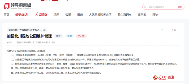 “盡快維修園區(qū)內破損公共設施;加強園區(qū)安保巡邏力度;及時跟蹤監(jiān)測景區(qū)水質、綠植、野生動物……”有群眾在人民網(wǎng)“領導留言板”圍繞西寧市北川濕地公園運營維護及日常管理方面提出建議。