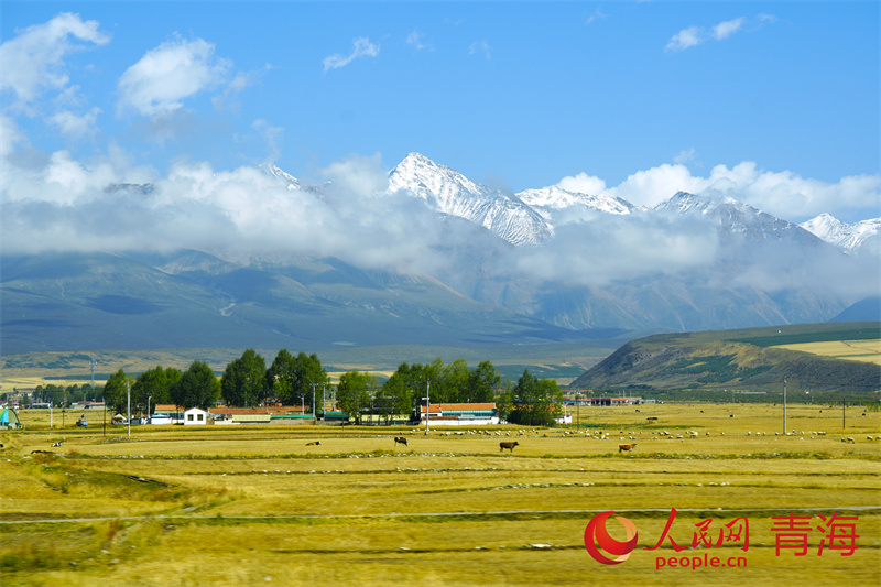 另一邊,青海省海北藏族自治州門源縣的山川河流也逐漸被秋色浸染。在藍(lán)天白云襯托下,一望無(wú)際的金黃更顯色彩斑斕。