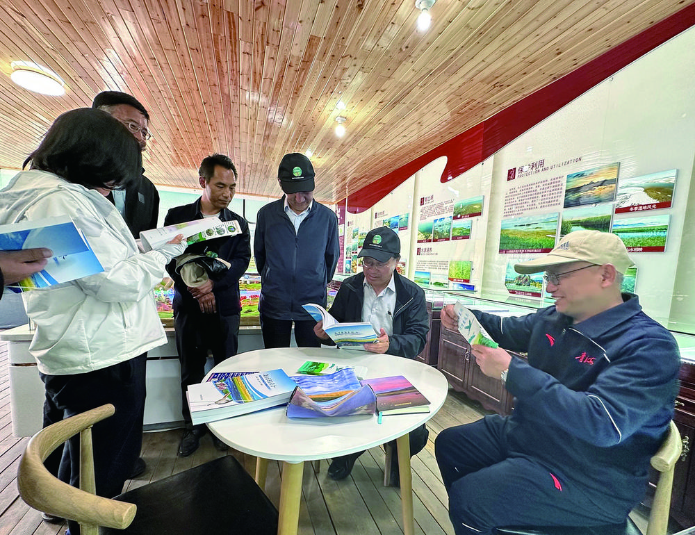 檢查組現(xiàn)場查看濕地保護宣傳彩頁和管護臺賬。青海日報記者 喬欣 攝