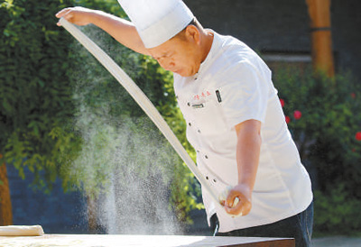 見到韓玉龍(見圖,李玉峰攝)時(shí),他正在向觀眾展示拉面絕活,只見他雙手上下翻飛,100克面團(tuán)化作縷縷“銀絲”,引得觀眾叫好。