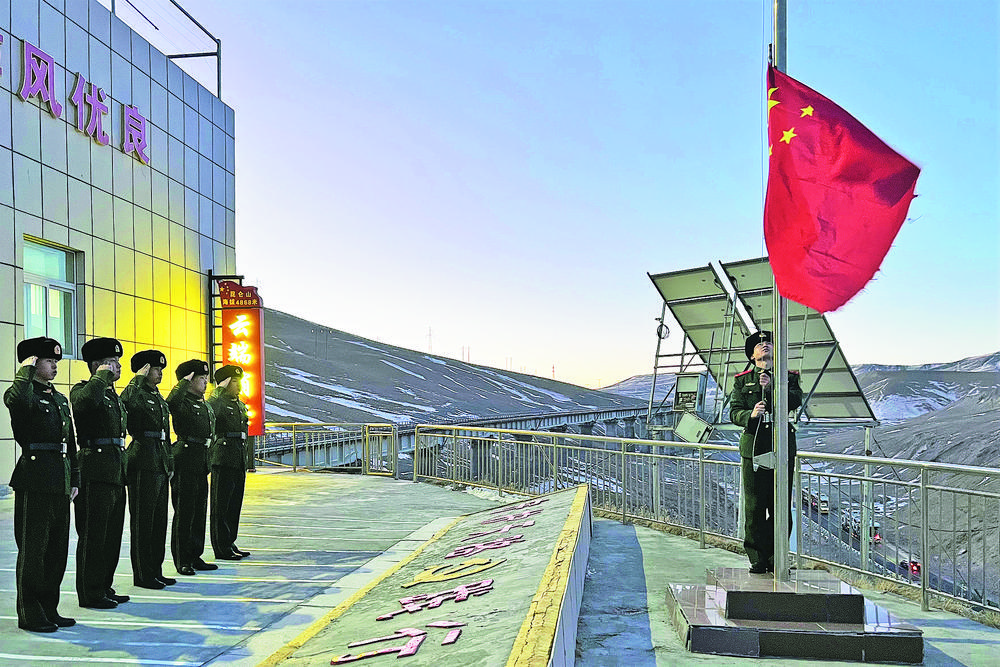 2024年1月1日,伴隨新年第一縷晨光,武警青??傟狘h委機關舉行2024年元旦升國旗儀式??傟牂C關全體官兵、文職人員軍容嚴整、精神昂揚,整齊列隊在國旗臺前,滿腔熱情迎接新年第一面國旗的升起。圖為武警青??傟犌嗖罔F路昆侖山隧道守護中隊2號哨官兵在海拔4868米的“云端哨卡”升起新年第一面國旗。張恒 攝