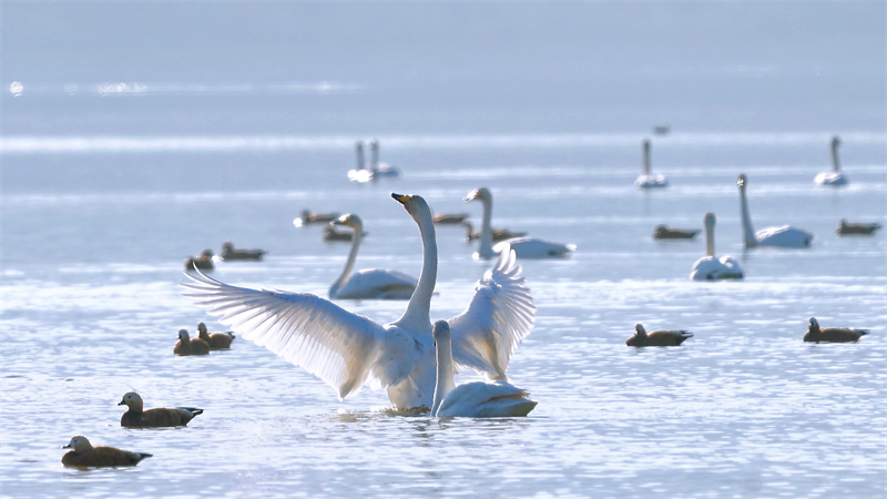 平靜的水面上,山光水色融為一體,潔白的天鵝似水中仙子,時而裊裊亭立,時而優(yōu)雅游弋,忽而游走,蕩起圈圈波紋……近日,青海省海東市化隆回族自治縣群科鎮(zhèn)安達(dá)其哈村的“天鵝湖”里,又多了許多前來越冬的大天鵝,優(yōu)雅的大天鵝、美好的生態(tài)環(huán)境、前來拍照的游客,成為冬日里化隆縣人與自然和諧共生的美麗風(fēng)景線。