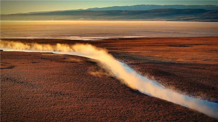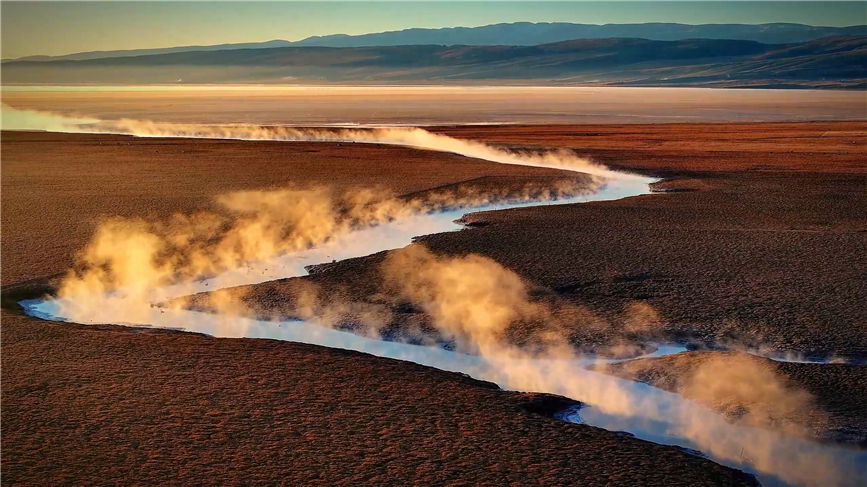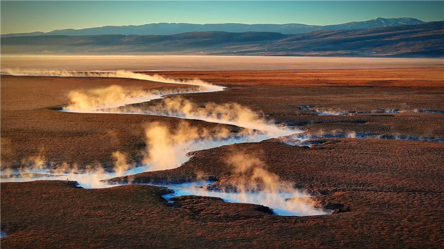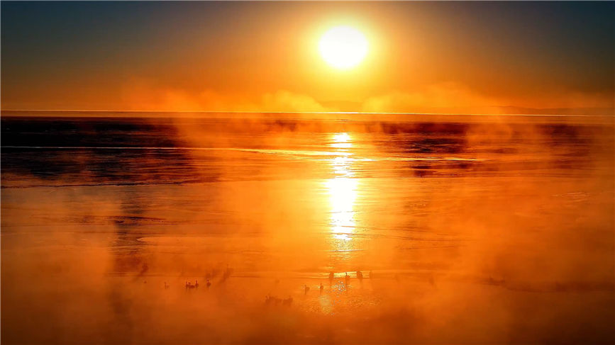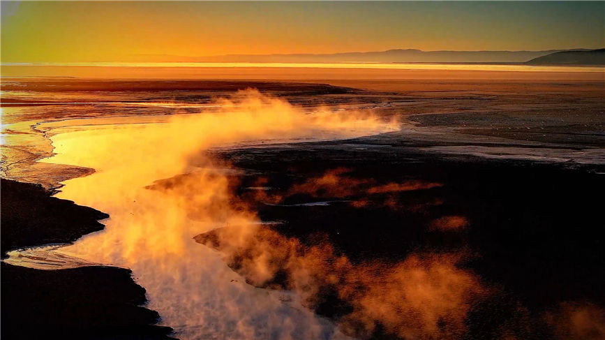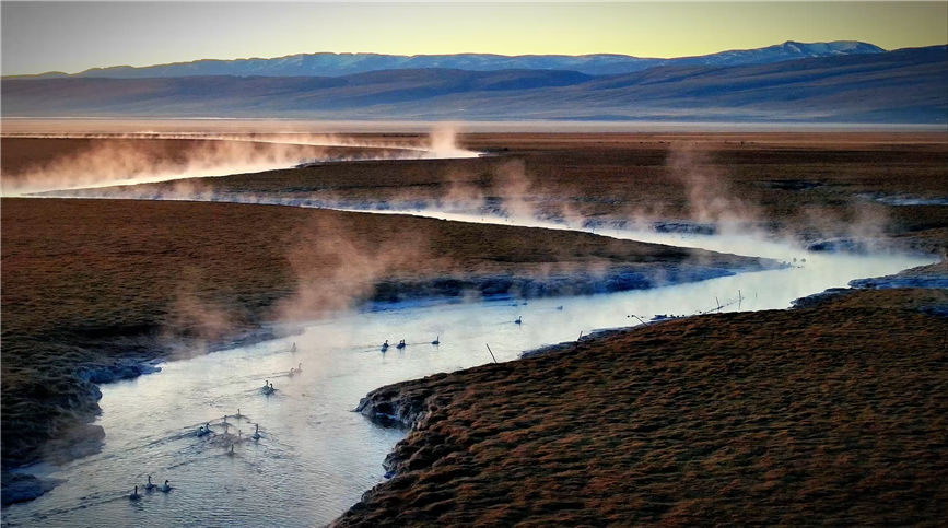 在青海湖泉灣濕地有一條冬天不結(jié)凍的小河,夜間空氣寒冷,溫暖的河水就蒸騰出霧氣,在霞光的照耀下頗為壯觀,當(dāng)太陽升高,氣溫變暖霧氣就會逐步消失。越冬的天鵝也生活于此。