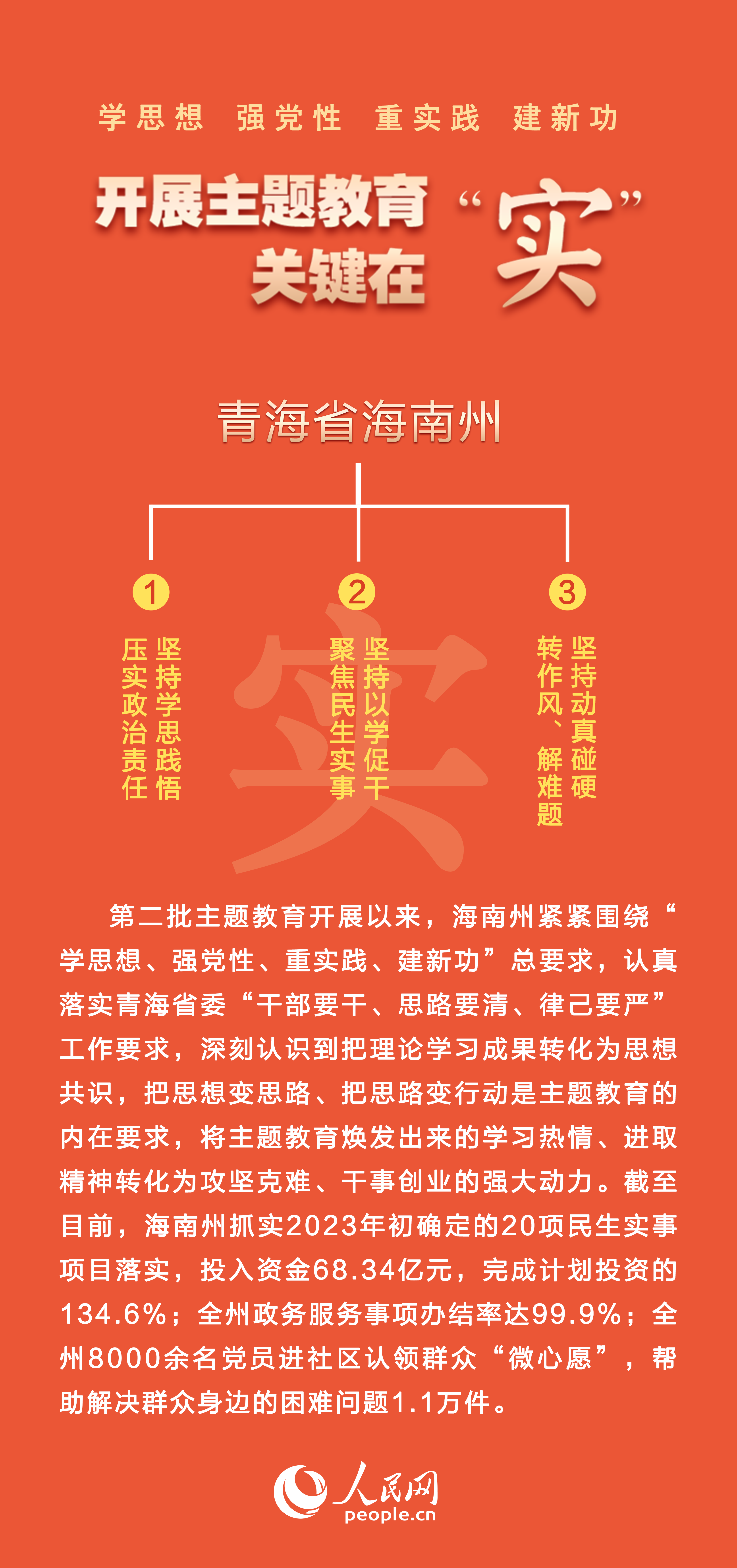 截至目前,海南州抓實(shí)2023年初確定的20項(xiàng)民生實(shí)事項(xiàng)目落實(shí),投入資金68.34億元,完成計(jì)劃投資的134.6%;全州政務(wù)服務(wù)事項(xiàng)辦結(jié)率達(dá)99.9%;全州8000余名黨員進(jìn)社區(qū)認(rèn)領(lǐng)群眾“微心愿”,幫助解決群眾身邊的困難問(wèn)題1.1萬(wàn)件。