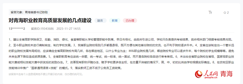近日,有群眾在人民網(wǎng)“領(lǐng)導(dǎo)留言板”就青海職業(yè)教育高質(zhì)量發(fā)展留言,該留言圍繞青海職業(yè)教育長(zhǎng)遠(yuǎn)規(guī)劃及職業(yè)教育院校編制審定、對(duì)外交流、考試招生等多個(gè)方面提出多條建議。