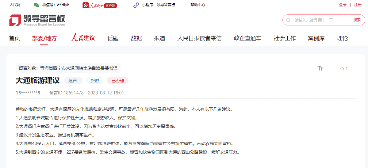 人民建議|網(wǎng)友對(duì)青海大通文旅發(fā)展提建議 官方分析研判給答復(fù)