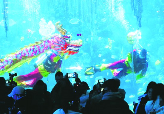 此外,海洋世界的海豚、海獅表演也是很受歡迎的項(xiàng)目?!皫Ш⒆觼砜春Q箴^的‘水下舞龍’特秀,潛水員在水底翻轉(zhuǎn)騰躍舞動‘龍身’的表演很棒,以新形式展現(xiàn)傳統(tǒng)民俗,讓我們感受到了濃濃年味。”西寧市民張先生說。