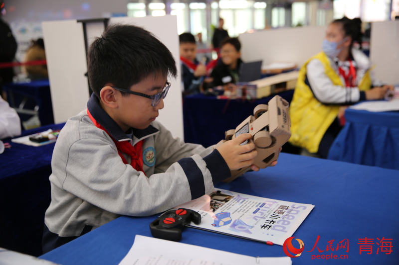 西寧市城西區(qū)古城臺小學(xué)的黨振洋和他的參賽作品“極速小卡車”。人民網(wǎng) 馬可欣攝
