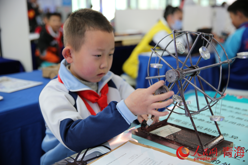 西寧市湟中區(qū)博華學(xué)校的劉生宇與他的參賽作品“鐵藝摩天輪”。人民網(wǎng) 馬可欣攝