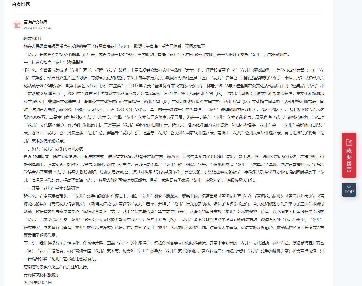 “‘花兒’是青海省的地域文化品牌。”收悉群眾對家鄉(xiāng)文化傳承發(fā)揚的建議后,青海省文化與旅游廳從打造和培育“花兒”演唱品牌、加大“花兒”歌手的培訓(xùn)力度、開展“花兒”學(xué)術(shù)交流研討三個方面作了具體回復(fù)。