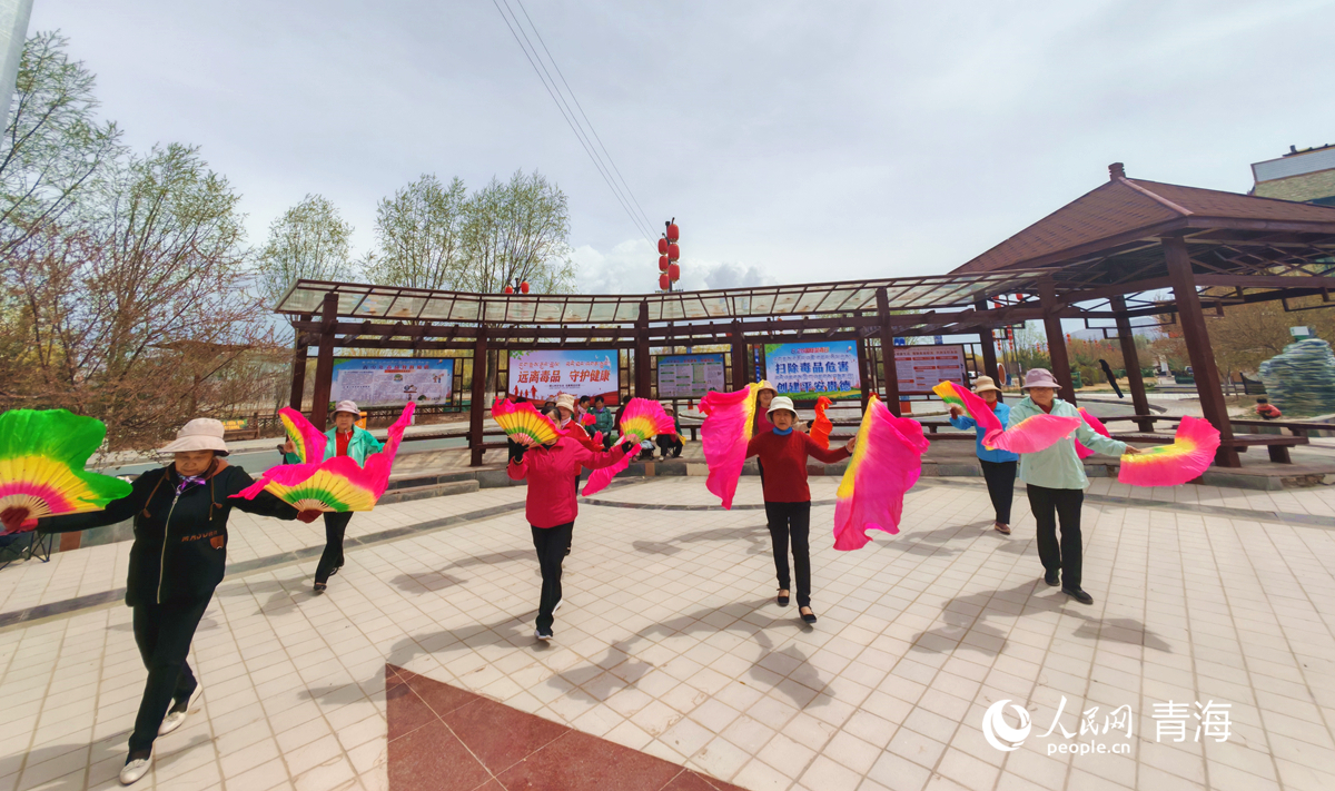 當(dāng)?shù)厝罕娫诮局黝}公園跳廣場(chǎng)舞,禁毒元素融入百姓日常生活。人民網(wǎng)記者 楊啟紅攝