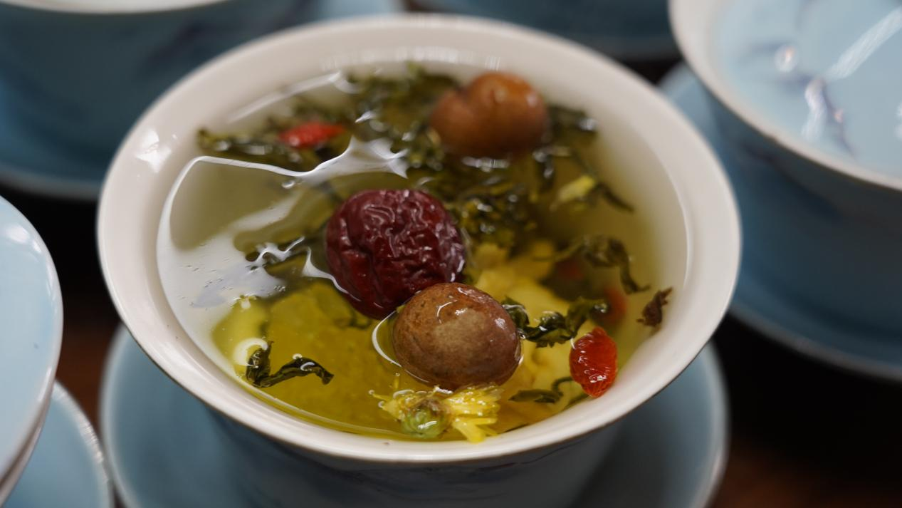 將綠茶、帶殼桂圓、紅棗、枸杞、冰糖等一起浸泡