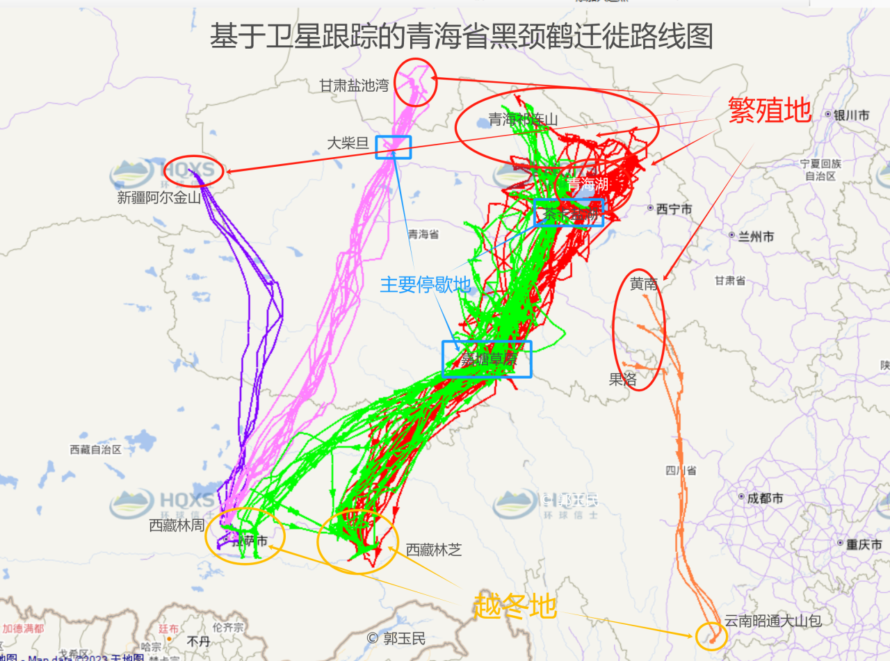 基于衛(wèi)星跟蹤的青海省黑頸鶴遷徙路線圖。青海省林業(yè)和草原局供圖
