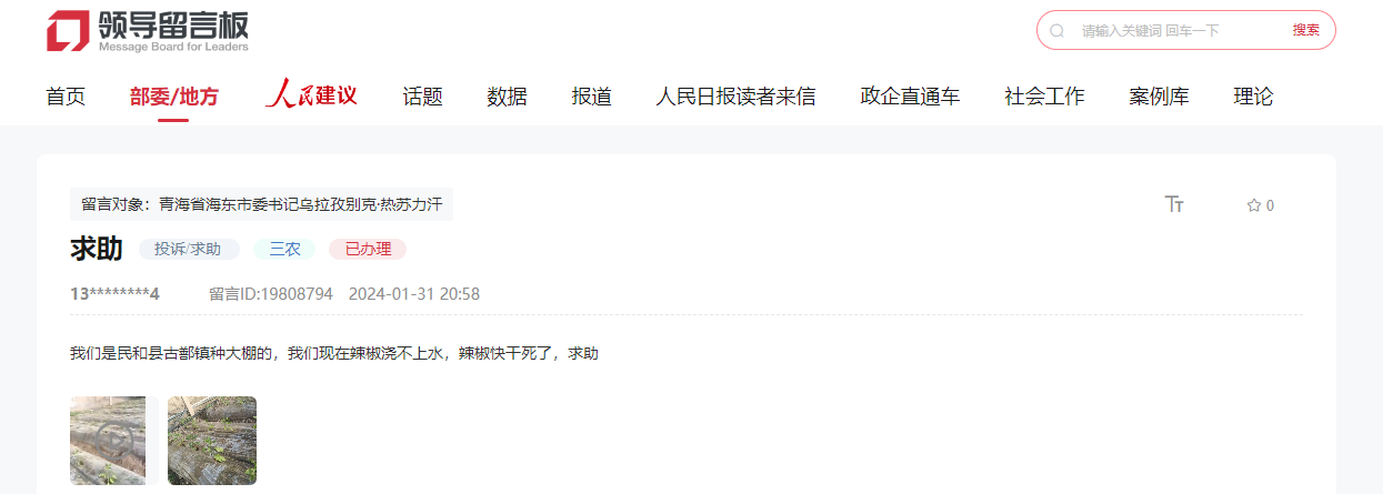 今年年初,有網(wǎng)友在人民網(wǎng)“領(lǐng)導(dǎo)留言板”留言表示,蔬菜大棚里的供水出現(xiàn)問題,作為種植戶眼看著大片農(nóng)作物因缺水無法成活,害怕影響收成所以十分著急。