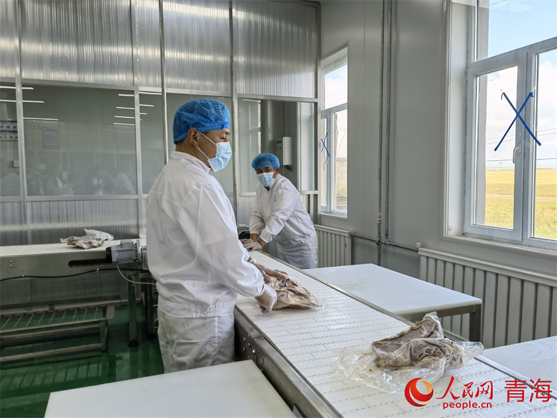 藍紋包頭網帽,齊髖豎領白衣,只見車間內工人們戴著手套熟練地進行著牛羊肉精分割工作,前腿肉、后腿肉等多種牛羊肉產品經真空包裝、速凍裝箱、打碼貼標后發(fā)往全國各地。青海省海南藏族自治州興??h河卡鎮(zhèn)幸福村牛羊肉分割車間里,一派繁忙景象。