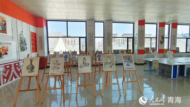 敞亮的美術(shù)館內(nèi)學(xué)生的畫作。人民網(wǎng)記者 張莉萍攝