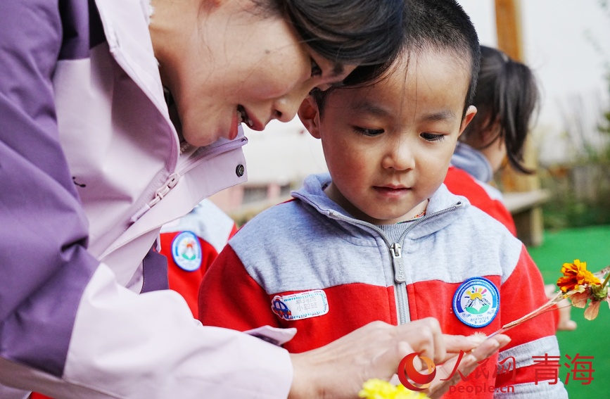 幼兒園老師帶孩子們認(rèn)識(shí)花朵。人民網(wǎng)記者 甘海瓊攝