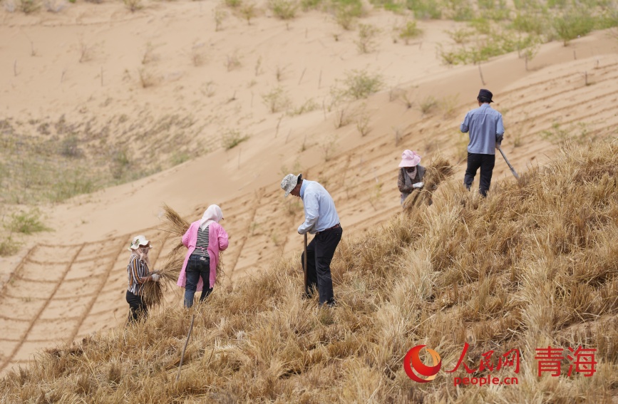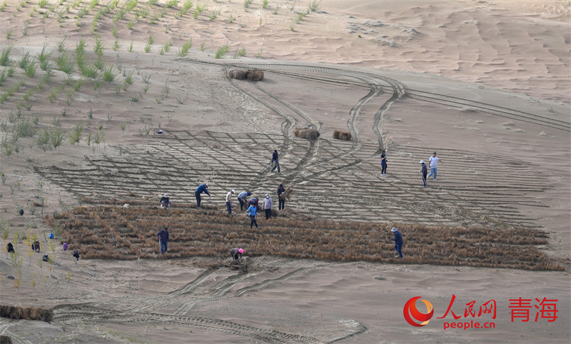 青海共和當(dāng)?shù)厝罕婇_展治沙工作。人民網(wǎng)記者 甘海瓊攝