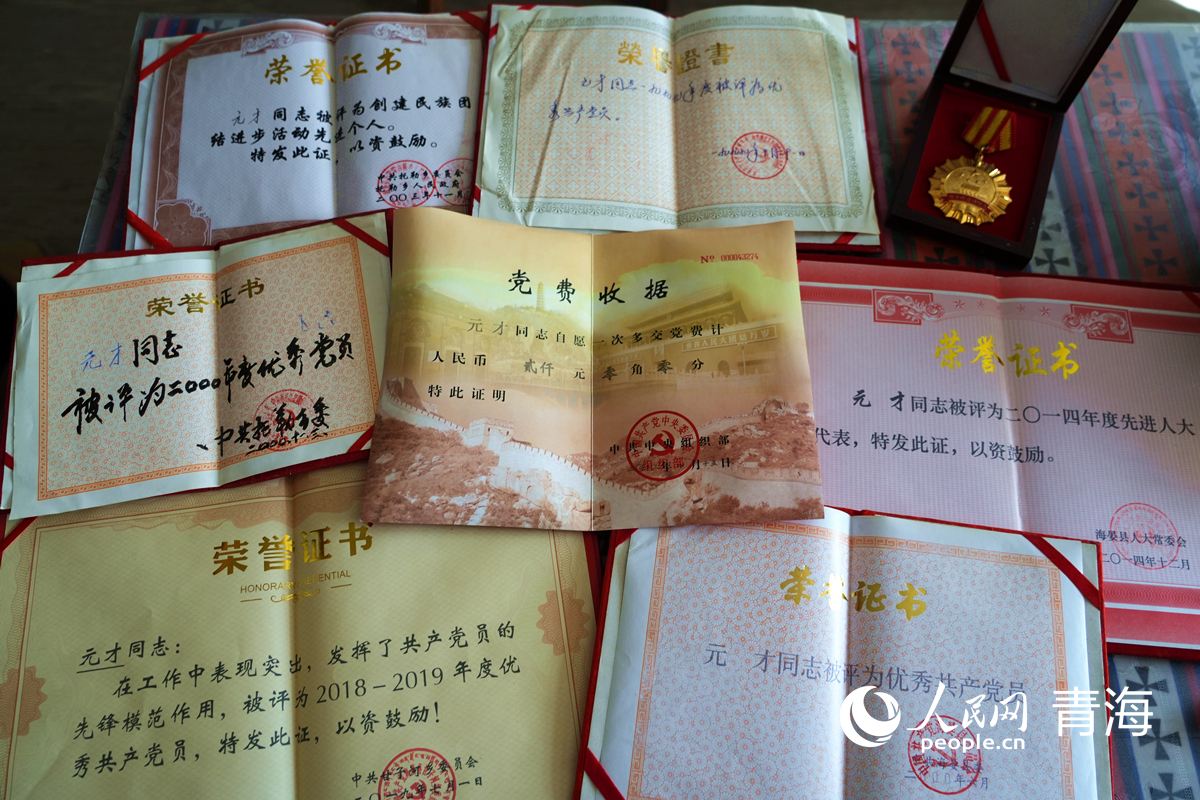 元才獲得的部分榮譽證書及獎章。人民網(wǎng)記者 楊啟紅攝