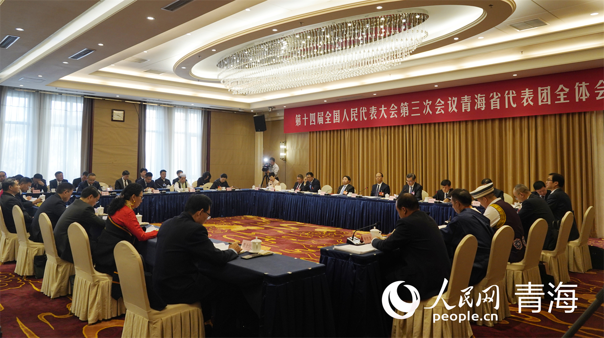 出席十四屆全國人大三次會議的青海代表團舉行全體會議。人民網記者 楊啟紅攝