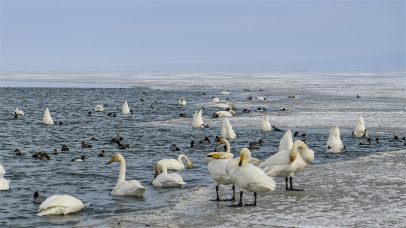 青海湖泉灣濕地內(nèi)的大天鵝。青海湖景區(qū)保護(hù)利用管理局供圖