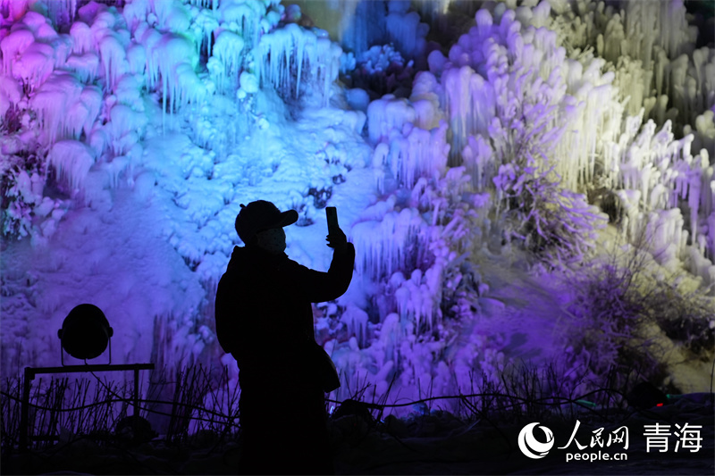 游客拍照打卡夜晚燈光下的宗家溝冰瀑景觀。人民網(wǎng) 馬可欣攝
