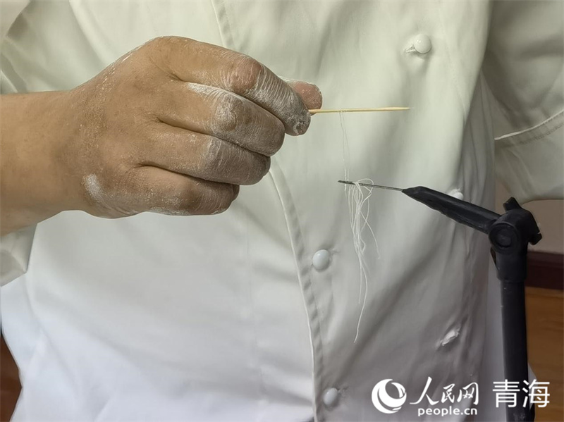 拉面師傅可以將面拉到可穿針的細度。人民網(wǎng) 馬可欣攝