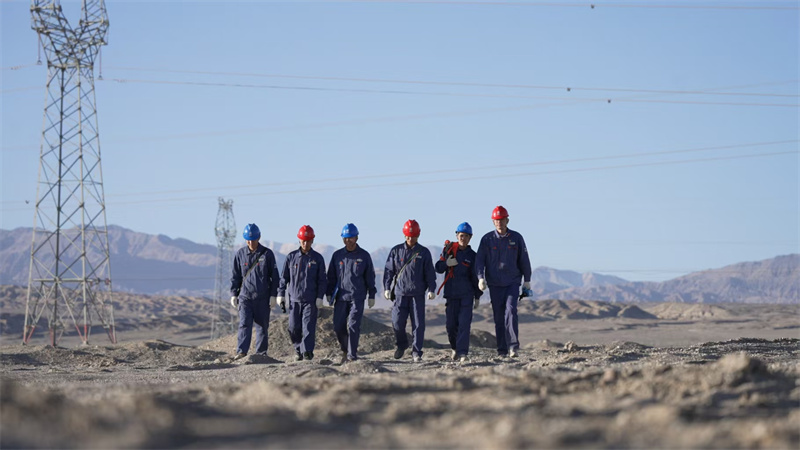 國網(wǎng)青海海西茫崖市供電公司員工在戈壁荒漠中巡線。王雅白攝