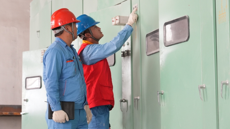 國網(wǎng)青海電力三江源(海西茫崖)共產(chǎn)黨員服務(wù)隊隊員在鹽湖(茫崖)鉀肥生產(chǎn)基地排查設(shè)備安全隱患。許小萍攝